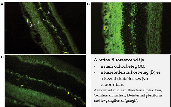 – a kezelt diabéteszes (C) csoportban.A=external nuclear, B=external plexifom, C=internal nuclear, D=internal plexiform and E=ganglionar (gangl.).